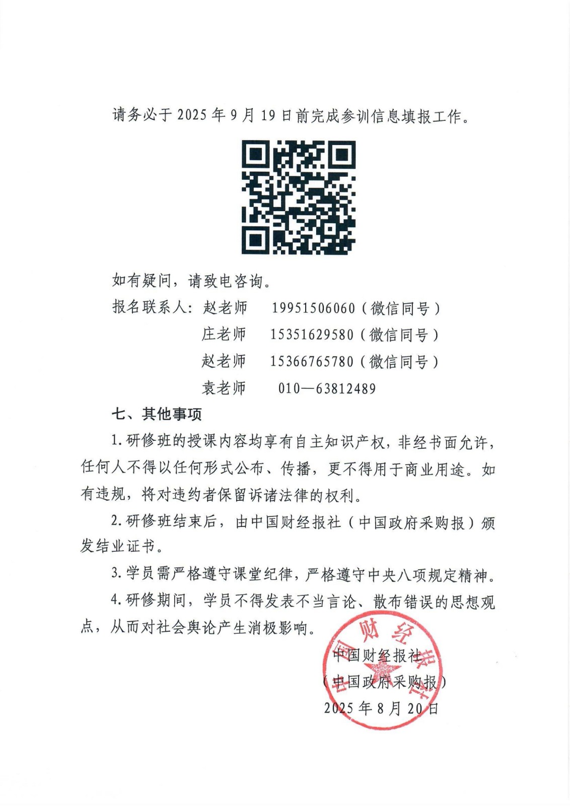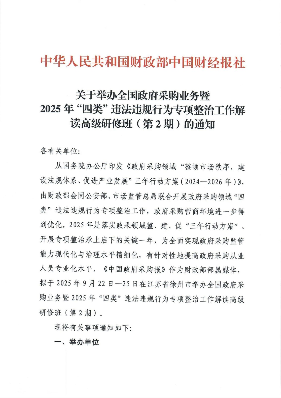 关于举办全国政府采购业务暨 2025年“四类”违法违规行为专项整治工作解读高级研修班(第2期)的通知